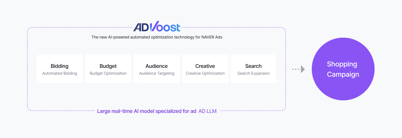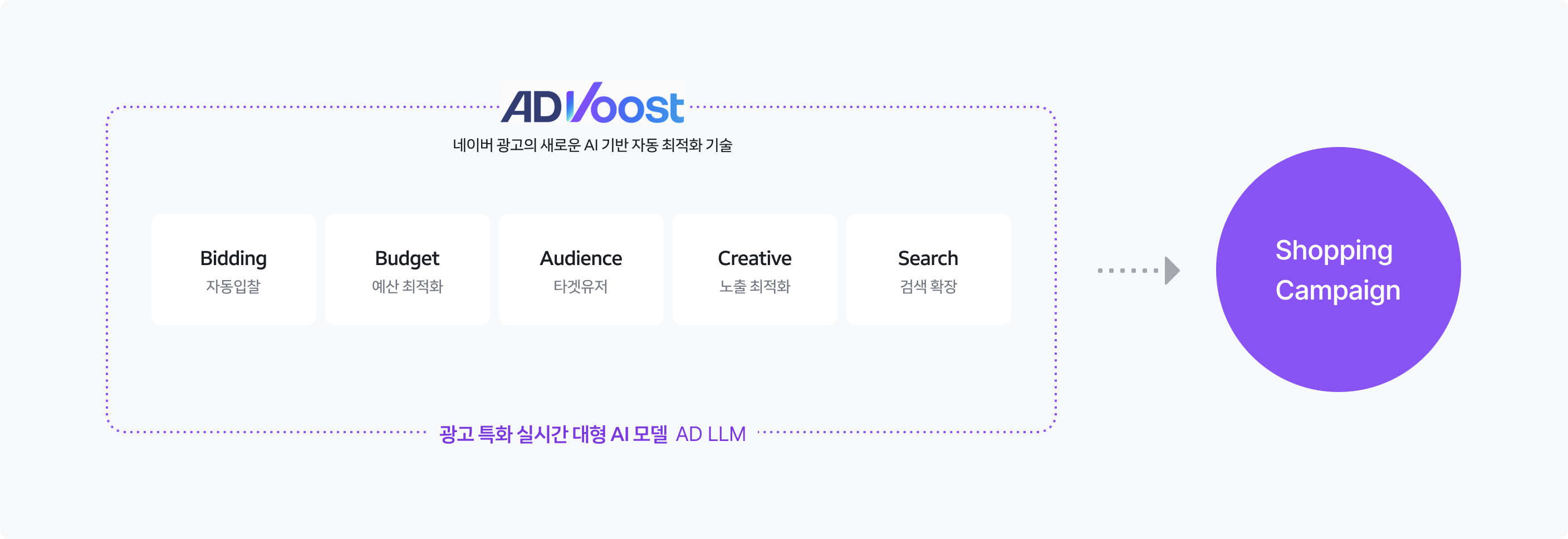 ADVoost는 입찰, 예산, 지면, 타겟팅, 소재 등 광고 집행을 위한 프로세스 전반을 AI 기반으로 완전히 자동화하여 광고주의 상품 판매를 최적화합니다.